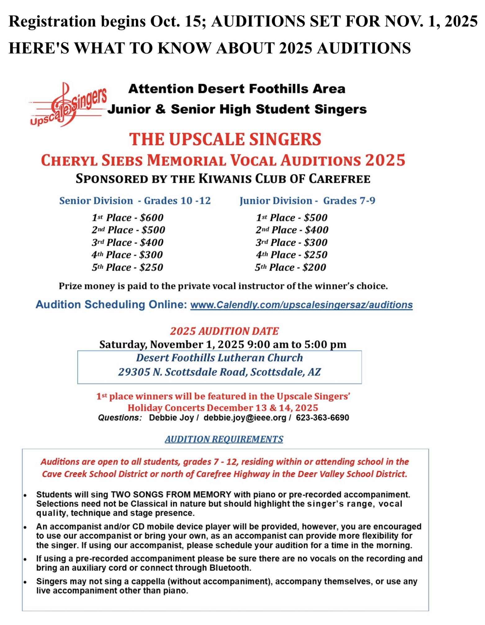 Online registration begins October 15 at www.Calendly.com/upscalesingersaz/auditions.
